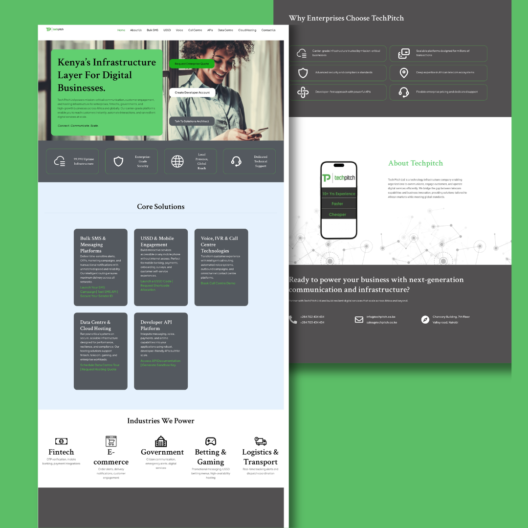 TechPitch is a Kenya based business powering mission‑critical communication, customer engagement, and hosting infrastructure for enterprises, fintechs, governments, and high‑growth businesses across Africa and globally.